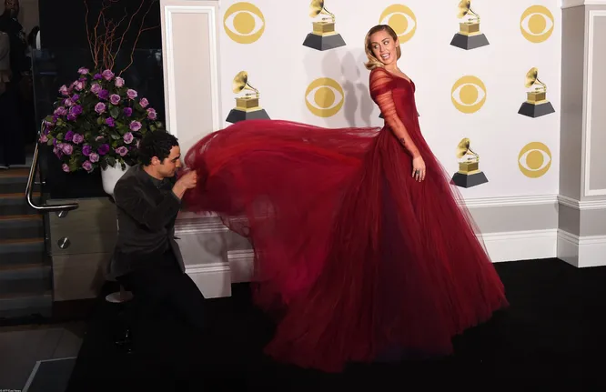 В этом году обошлось без модных провалов и смелых экспериментов, и «виной» тому руководство канала CBS, которое строго-настрого порекомендовало гостям церемонии облачаться в соответствии с вечерним дресс-кодом. Поэтому даже фэшн-хулиганки Леди Гага и Рита Ора были сдержанны и элегантны, Лана Дель Рей надела нимб со звездами — видимо, в качестве аллюзии на прошлогодний образ Бейонсе, а Майли Сайрус и вовсе предстала перед публикой под руку с Заком Позеном, который взбивал пышную юбку на ее воздушном платье и по-отечески гордился своей звездной подопечной.