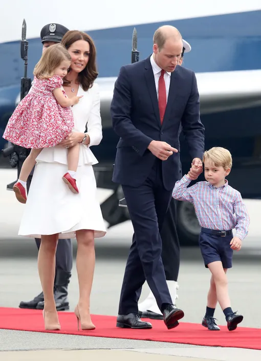 Монаршее семейство в полном составе приземлилось на польской территории. Трехлетний принц Джордж и двухлетняя принцесса Шарлотта составили компанию своим родителям — юные наследники привыкли к королевским обязанностям с пеленок. В программе двухдневного визита — ланч с польской президентской четой и прогулка. Остановятся супруги в Бельведерском дворце. С трапа самолета герцогиня Кембриджская спустилась в ослепительно-белоснежном костюме с баской от Alexander McQueen.