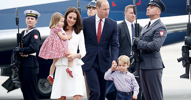 Монаршее семейство в полном составе приземлилось на польской территории. Трехлетний принц Джордж и двухлетняя принцесса Шарлотта составили компанию своим родителям — юные наследники привыкли к королевским обязанностям с пеленок. В программе двухдневного визита — ланч с польской президентской четой и прогулка. Остановятся супруги в Бельведерском дворце. С трапа самолета герцогиня Кембриджская спустилась в ослепительно-белоснежном костюме с баской от Alexander McQueen.