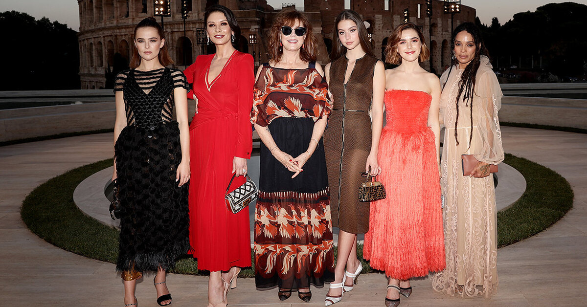 Сьюзен Сарандон, Кэтрин Зета-Джонс и Кьяра Ферраньи на показе Fendi в память о Карле Лагерфельде
