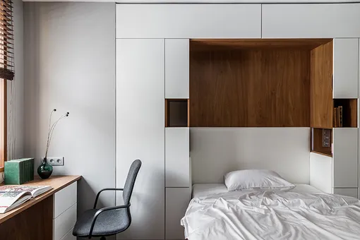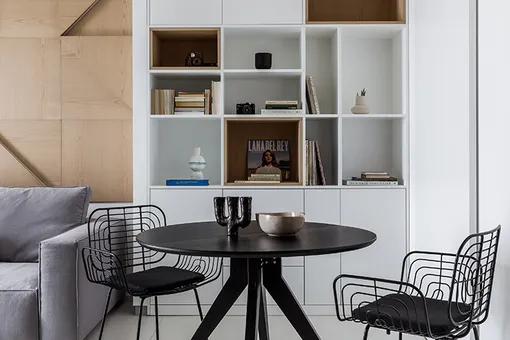 Функциональная мебель не значит «некрасивая», в минимализме продумывается каждый сантиметр. Если книжный шкаф, то просчитывается скрытое и открытое хранение, если рабочий стол, то предполагается много мест для хранения канцелярии, кровать-консоль, которая прячется в стену или, например, модульный диван, который мобильно можно превратить в удобную зону отдыха. Минимум отдельно стоящей мебели, максимум скрытой, иногда даже многофункциональной-шкаф-кровать, кухня-перегородка и шкаф.