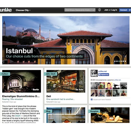 Unlike (unlike.net). Этот блог рассказывает о новых и лучших ресторанах, барах, магазинах, клубах и галереях по всему миру. К сожалению, список городов пока еще не назовешь исчерпывающим (например, здесь нет Рима, зато есть Копенгаген, Тель-Авив и Сан-Паулу), но коллекция полезных адресов пополняется каждую неделю.