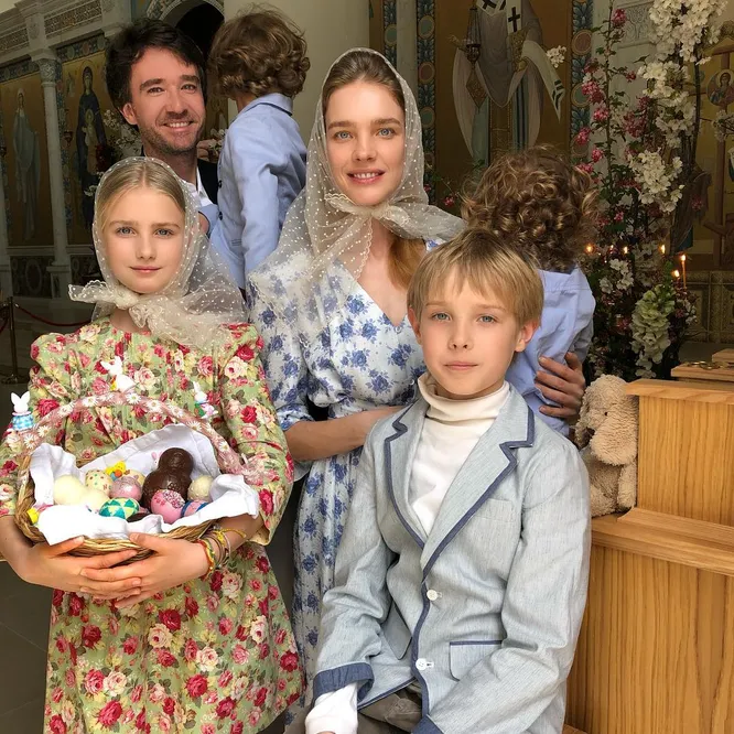 Наталья Водянова отпраздновала Пасху в кругу семьи: вместе с супругом Антуаном Арно и четырьмя детьми модель посетила службу в православном храме в Париже. На фото Наталья позирует в прозрачной косынке и «крестьянском» платье в цветочек, ее 12-летняя дочка Нева (тоже в цветочном платье и таком же платке) держит в руках корзинку с пасхальными яйцами, а все мужчины одеты в костюмы голубого цвета.