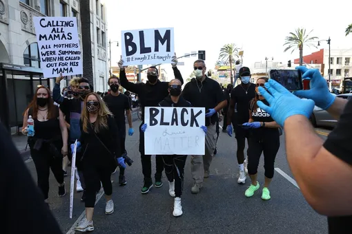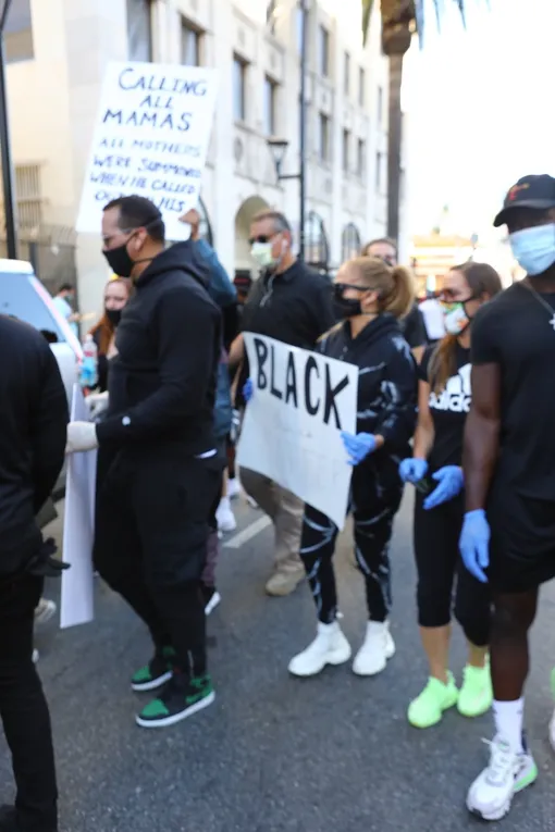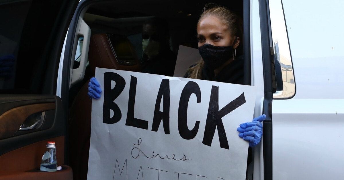 Дженнифер Лопес и Алекс Родригес поддержали протестующих в Голливуде: в колонне двигалось более 20 тысяч людей. Влюбленные выразили свою активную гражданскую позицию с плакатами в руках. Певица и ее жених оделись в парные образы и не забыли о защитных масках. Эти аксессуары нового времени они выбрали черного цвета.