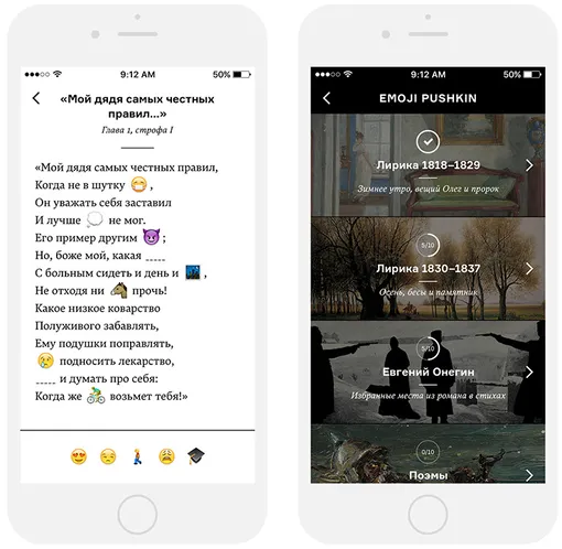 В эпоху Instagram (Социальная сеть признана экстремистской и запрещена на территории Российской Федерации) даже произведения классика русской литературы Александра Сергеевича Пушкина могут быть рассказаны при помощи эмодзи. Проверить эту мысль на деле решили в команде «Арзамас» и выпустили мобильное приложение Emoji Pushkin. Цель игрока — подставлять эмодзи вместо слов, которые пропущены в cамых знаменитых пушкинских произведениях.