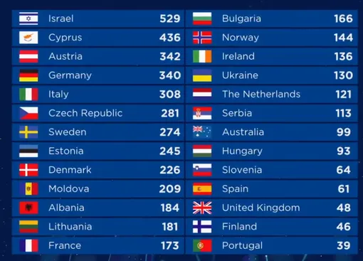 Сегодня ночью в Лиссабоне состоялся финал песенного конкурса Евровидение. В этом году победителя вновь определяли, суммируя баллы экспертного жюри из всех стран-участниц и голоса телезрителей. В итоге победу завоевала конкурсантка из Израиля Нетта Барзилай с песней «Toy».