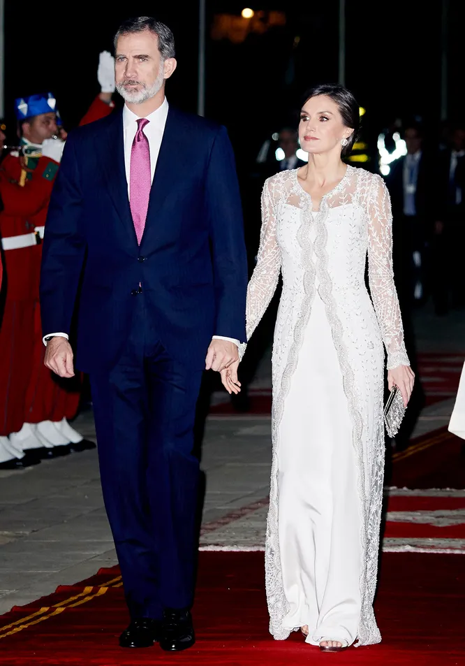 Королеву Летицию по праву считают одной из самых элегантных первых леди в мире, и каждым своим выходом она подтверждает свой негласный титул. В эти дни Летиция вместе с супругом Филиппом VI гостит в Марокко: вчера вечером королевская чета посетила торжественный гала-ужин, прошедший в Королевском дворце в Рабате. На прием, устроенный в честь почетных гостей королем Мухаммедом VI, первая леди Испании прибыла в белоснежном платье Felipe Varela с кружевной накидкой, с клатчем того же авторства, в босоножках от любимого испанского бренда Magrit и украшениях из коллекции Joyas de Pasar, созданной по дизайну королевы Виктории Евгении. Безупречно!