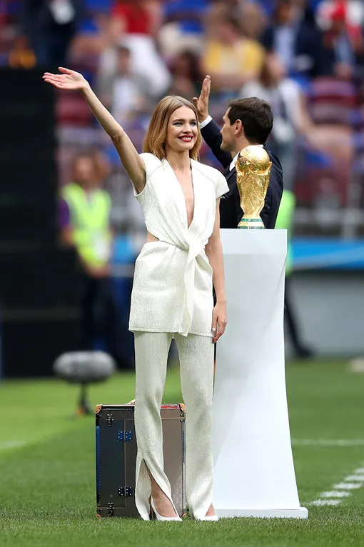 Кубок в футляре-сундуке Louis Vuitton, вручаемый за победу на чемпионате, на стадион вынесли Наталья Водянова и чемпион мира 2010 года, вратарь сборной Испании Икер Касильяс.