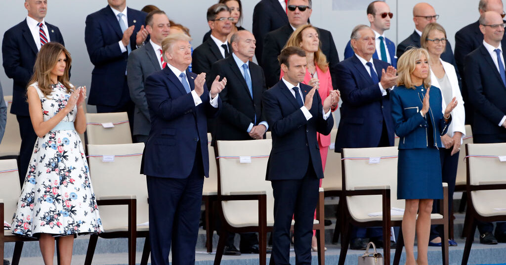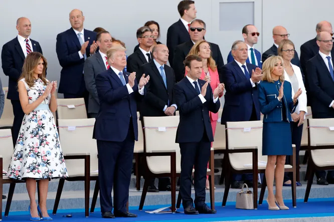 Вчера в Париже на Елисейских Полях прошел традиционный военный парад по случаю Дня взятия Бастилии. В этом году помимо демонстрации военной техники и авиации, а также марша различных войск, организаторы решили удивить зрителей исполнением каверов на треки электронного дуэта Daft Punk. Среди почетных гостей мероприятия были 39-летний президент Франции Эммануэль Макрон и 71-летний президент США Дональд Трамп. Оператор поймал реакцию Макрона и Трампа во время прослушивания духовой версии Get Lucky.