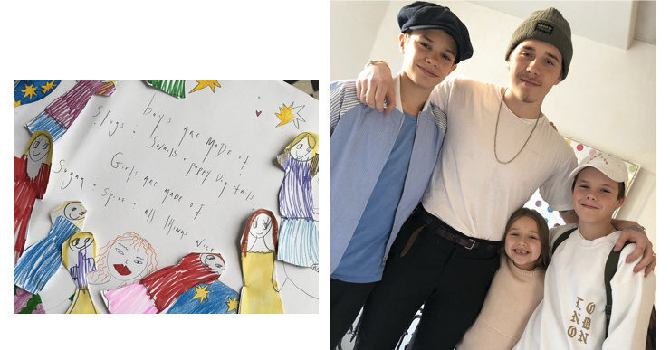 На днях мы любовались парным выходом Дэвида и Виктории Бекхэм, подмечая, как в их образах сочетаются лед и пламень — классика и тренды — и радуясь, что и через много лет их чувства не ржавеют. Теперь же Виктория не может скрыть радости: ее старший сын Бруклин на время приехал из Нью-Йорка, где он учится на фотографа, чтобы побыть с семьей, и теперь все семейство Бекхэмов, наконец, в сборе. Вики не удержалась и поделилась хорошим настроением с подписчиками, а заодно опубликовала снимок Бруклина, Ромео, Круза и Харпер с подписью: «Я так рада!!! Все мои дети собрались вместе». А потом показала открытку, которую они весь день делали с дочкой. Ну есть ли в мире семья милее, чем Бекхэмы?