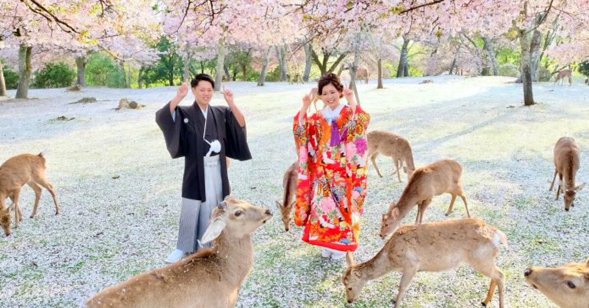 Фотограф отправился в парк с женихом и невестой, но отнюдь не молодожены оказались главными героями фотосета. Казуки Икеда заснял пятнистых оленей, разгуливающих по парку среди цветущих деревьев нереальной красоты.
