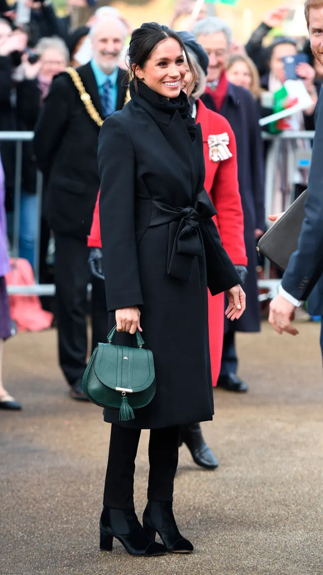 Вчера принц Гарри и его будущая супруга Меган Маркл отправились с официальным визитом в столицу Уэльса, город Кардифф, где их ждала насыщенная программа. Перед публикой невеста принца появилась в элегантном черном тотал-луке. Все внимание приковывало пальто от Stella McCartney с поясом-бантом. На Меган также были бархатные ботильоны Tabitha Simmons, джинсы от уэльского бренда Hiut Denim, а в руках - зеленая сумочка DeMellier London, которая разбавила монохромный образ. Под пальто скрывался клетчатый топ-жакет Theory. Такой набор обошелся Маркл в 3 600 долларов.