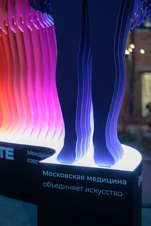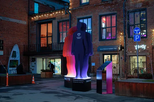 Инсталляция на «Флаконе» стала одним из арт-объектов, созданных специально к открытию выставки. В ее основу авторы заложили визуальный образ главного героя экспозиции: многослойная фигура человека выражает идею о сопричастности и постоянной поддержке, которую мы должны оказывать друг другу.