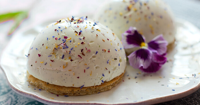 Для приготовления творожных куполов желатин залейте водой, дайте набухнуть и подогрейте до растворения гранул. Ни в коем случае не кипятите! Из половины стручка ванили выньте семена. В ложке разотрите 12 таблеток сахарозаменителя, добавьте немного кипятка и подождите, пока таблетки растворятся. Творог положите в глубокую посуду, добавьте семена ванили, желатин и сахарозаменитель. Взбейте смесь блендером до получения однородной, гладкой массы. Разложите творожную массу по формам и отправьте в холодильник на 3 часа. Для сборки пирожного на бисквитный круг аккуратно уложите творожную полусферу. Украсьте мелкими цветами.