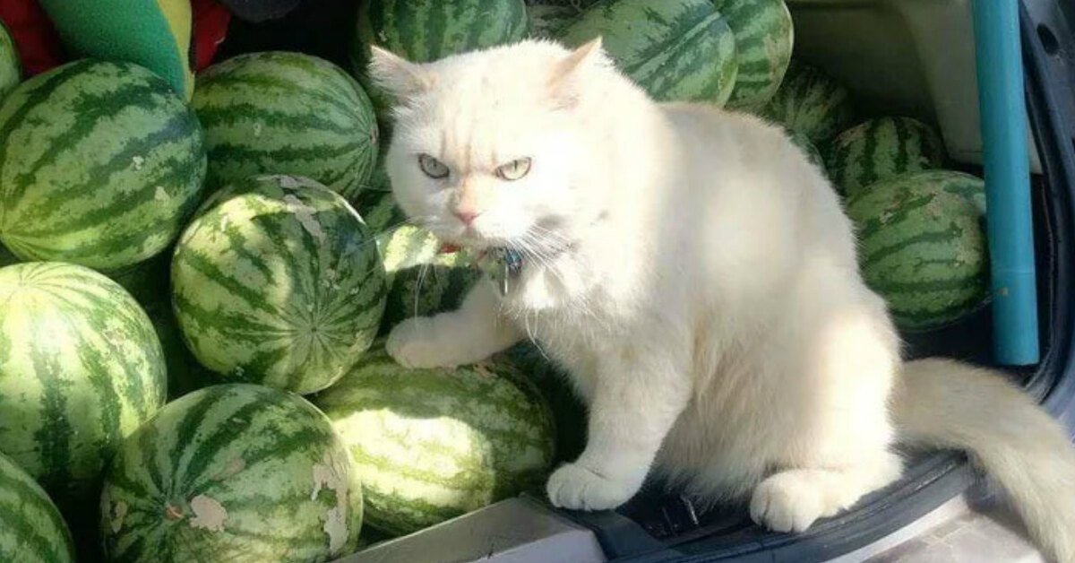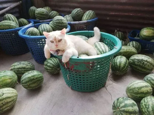 Этот суровый кот по кличке Жемчужинка охраняет арбузы в Таиланде — и делает это силой одного взгляда