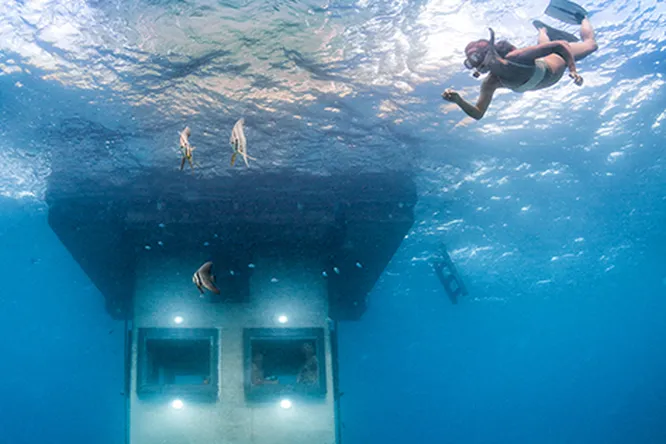 В английском языке есть мрачноватое выражение «sleep with fishes», которое в русском переводе звучит как «пойти на корм рыбам». Владельцы танзанийского отеля The Manta Resort решили перевернуть значение этой фразы с ног на голову, придав ей исключительно положительный смысл. С 1 ноября здесь можно забронировать мини-виллу, где спальня находится непосредственно под водой! Кровать окружена панорамными окнами, чтобы постояльцы не упустили из виду ни единого обитателя глубин. Безусловно, такие апартаменты не предназначены для слабонервных путешественников, но думаю, что я бы точно решилась остановиться там на пару ночей.