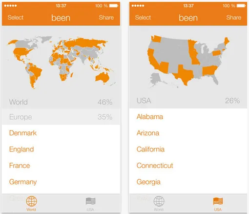 Несерьезное приложение понравится путешественникам, которые любят составлять списки и не прочь похвастаться своими достижениями. Отмечайте на карте страны, в которых вы уже побывали, и been подскажет, как много вы повидали на том или ином континенте – в процентном соотношении. Заполненную карту можно опубликовать в любой социальной сети в пару кликов.