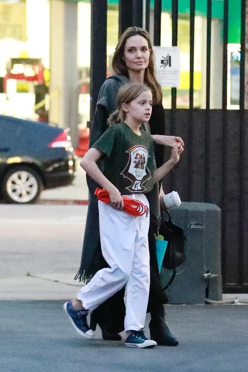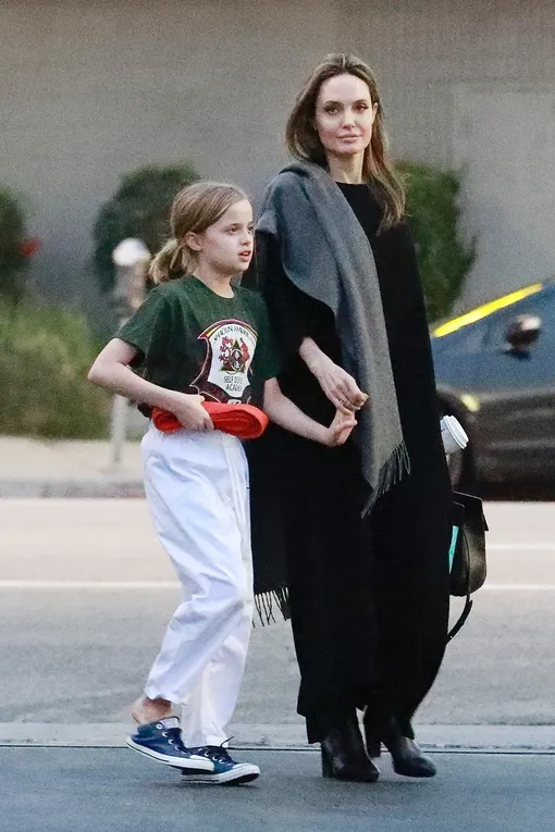 Если Брэд Питт сейчас поглощен новыми отношениями, то Анджелина Джоли остается образцовой мамой и все свободное время проводит с кем-то из шестерых детей. Вчера актрису заметили в Лос-Анджелесе: звезда «Малефисенты» лично отвела дочь Вивьен на тренировку по боевым единоборствам, а сама коротала время за кофе, купленным в одной из сетевых кофеен. 43-летняя Анджелина составила компанию дочери в черном платье-балахоне в формате макси, кожаных сапогах на блочном каблуке и сером палантине.