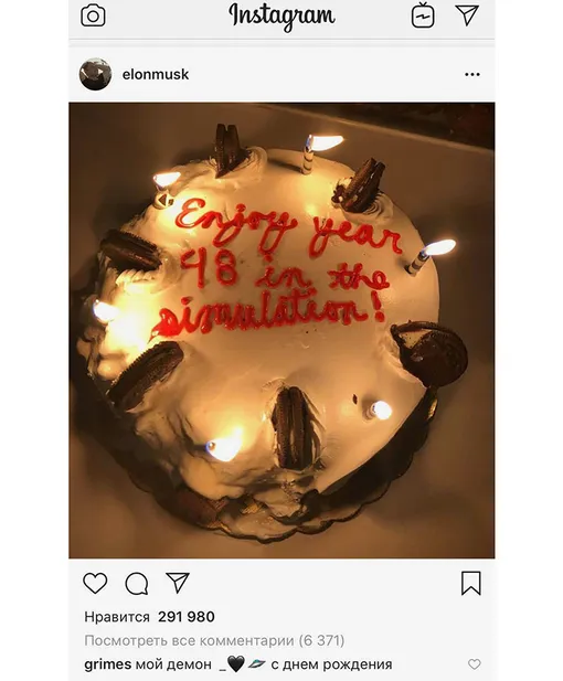Слухи о романе самого известного миллиардера современности и основателя Space X Илона Маска и певицы Grimes ходят с тех пор, как молодые люди появились вместе на красной дорожке Met Gala этой весной. Пара никак не комментировала свои отношения, хотя все мировые СМИ были уверены, что Илон и Клер Буше вместе. Сегодня, в день рождения Илона, в Инстаграме (Социальная сеть признана экстремистской и запрещена на территории Российской Федерации) вызвал ажиотаж комментарий 30-летней певицы под последним постом Маска. Под снимком, где изображен праздничный торт в честь 47-летия предпринимателя с шутливой подписью о симуляции его 48-летия, Клер Буше (настоящее имя Grimes) написала на русском языке: «Мой демон. С днем рождения». Подпись подкреплена эмодзи в виде сердца.Это стало первым официальным заявлением пары об их отношениях, ведь теперь факт, что молодые люди действительно больше чем друзья, очевиден.