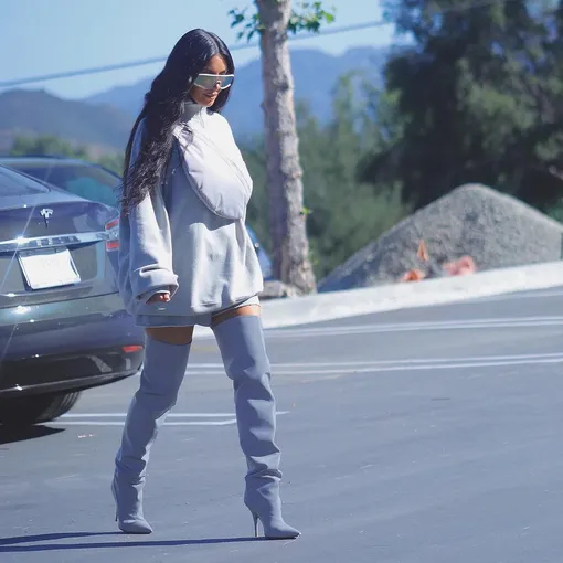 На фото, сделанном в калифорнийском городке, где живет большая часть клана Кардашьян, Ким позирует в сером свитшоте oversize, фирменных замшевых ботфортах выше колена, с сумкой кросс-боди того же цвета и в зеркальных солнцезащитных очках в пол-лица. Все вещи — из новой коллекции ее супруга Канье Уэста для бренда Yeezy. Похоже, прогулка Ким под палящим солнцем не что иное, как пиар-акция для повышения продаж.