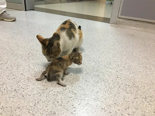 Кошка смогла доставить котенка прямо в отделение реанимации. Малышу оказали неотложную помощь, а его мама в этот момент ни на секунду старалась не терять его из вида. Маме предложили корм и молоко, но от переживаний она едва ли смогла насытиться. После этого кошку и ее малыша отправили к ветеринару, чтобы уже точно убедиться, что с этим пушистым семейством все в полном порядке.