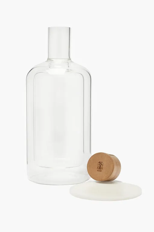 Дизайнера Брунелло Кучинелли называют королем кашемира, яркие свитера и уютные костюмы его бренда обожают во всем мире. Однако теперь в ассортименте Brunello Cucinelli появилась новинка — емкость для воды, которую охарактеризовали как «стеклянная бутылка с двойными стеклами», а приобрести ее можно за $995.