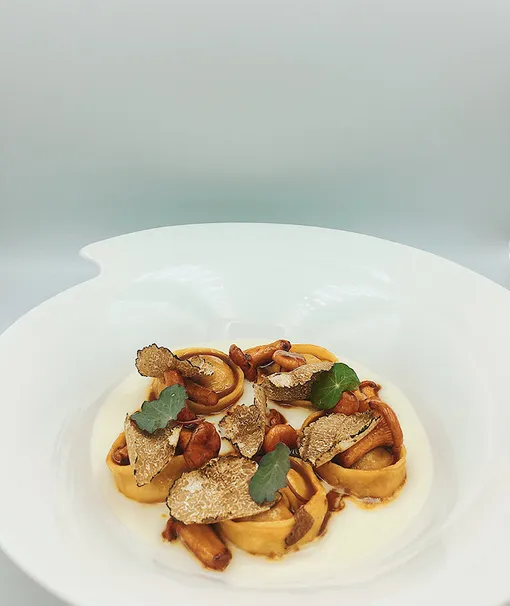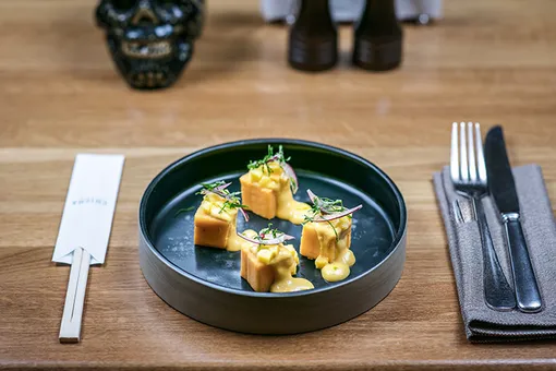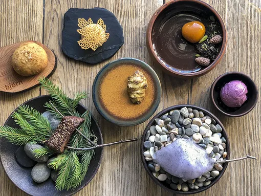 В ресторане Björn кормят так называемой новой скандинавской кухней. Скандинавское начало транслируется через свежесть ингредиентов, лаконичность и понятность без излишних наворотов. Шеф-повар Никита Подерягин использует в сете продукты, которые находятся на пике сезонности. В каждой подаче рассказывается отдельная история. Блюда, вошедшие в фестивальный сет от Björn, – это «Камни и шишки», «Топинамбур и копченая утка», «Косуля по-черному», «Неттлеуст и печеный каштан», «Черника в паутине» (мороженое из черники, черничный мармелад и черничная сладкая вата), «Осенний лист» (тесто для листа готовится на основе муки из топинамбура). Заинтригованы? Неттлеуст, к примеру, это мягкий домашний сыр с белой плесенью, выдержанный в крапивных листах с пюре и дополненный крамблом из печеных каштанов. А «Камни и шишки» — это паштет из утки и оленя с карамельным луком, крошка ржаного хлеба, затемненная пудрой из жженых овощей и шишки из исландского сыра «Скир» с молотым фундуком. В виде камня оформлен тыквенный мусс в тыквенной глазури.