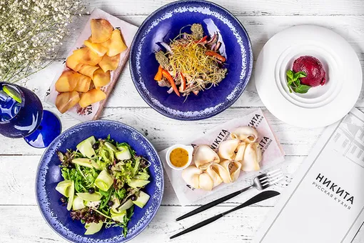 «Никиту» любят большие чиновники, серьезные девушки с водителями и семейные пары с детьми. Заведение, разместившееся в особняке начала двадцатого века, напоминает загородную усадьбу с самоварами, трансформировавшимися в светильники, абажурами из павловопосадских платков и винтажными действующими каминами... И чем холоднее будет в Москве, тем притягательнее будут все эти киноа с кроликом в горшочке и утиные ножки с пюре из айвы. Для участия в Московском гастрономическом фестивале команда ресторана подготовила сет из пяти блюд, предваряющих осеннее обновление меню. В сет вошли карпаччо из репы, сало угольной рыбы на гималайской соли, зеленый салат с трюфельным маслом и дегидрированной смородиной, строганов из оленины и домашний сорбет из смородины.