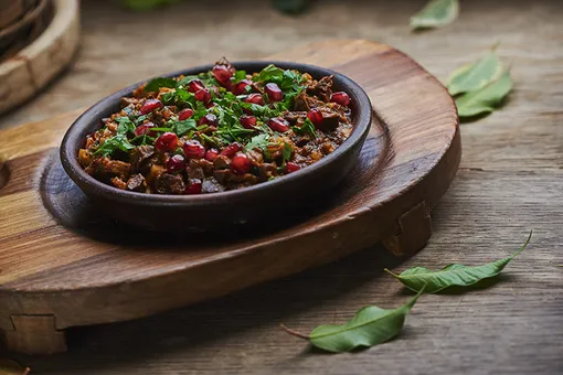 Говяжьи потрошки — сердце, легкое, рубец — чистим, промываем и варим до готовности. Затем мелко нарезаем и заправляем красной аджикой. Добавляем приправы, хмели-сунели, кориандр, кондари и желтый цветок. Нарезаем лук и выкладываем всю заготовку в сковородку. Обжариваем, добавляем соль и свежую кинзу. При подаче украшаем зернами граната.