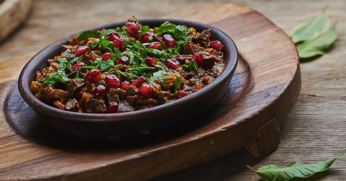 Говяжьи потрошки — сердце, легкое, рубец — чистим, промываем и варим до готовности. Затем мелко нарезаем и заправляем красной аджикой. Добавляем приправы, хмели-сунели, кориандр, кондари и желтый цветок. Нарезаем лук и выкладываем всю заготовку в сковородку. Обжариваем, добавляем соль и свежую кинзу. При подаче украшаем зернами граната.