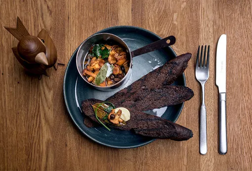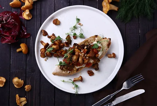 Брускетта с лисичками и хумусом в ресторане Dilly