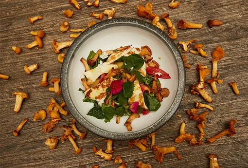 Салат с лисичками и сыром халуми в ресторане Modus