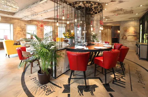«Блок» расположился на крыше «Ленинград Центра» в Таврическом саду Санкт-Петербурга. Правда, попасть в святилище местных стейков удастся лишь минуя главный холл культурно-массового комплекса, сквозь рамку металлоискателя и пристальный взор охранника. Дальше лифт, а выше – просторная зала-атриум с интерьером, доставшимся, увы, от самого «Ленинград Центра». Весьма элегантно, однако для мясного ресторана холодновато. Но не стоит обращать внимание на такие мелочи. Ресторан в первую очередь строят для того, чтобы в нем есть. В первые дни работы «Блок» был практически пустой: за столиками под стеклянной крышей нам лишь изредка встречались петербургские шеф-повара, желающие отведать питерский дебют Раппопорта.