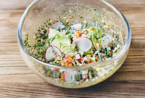 Болгарский перец, огурец, редис, салат романо и сельдерей режем на кусочки. Морковь натираем на терке. Зеленый лук и кинзу мелко режем.
