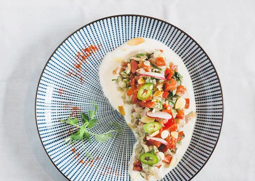 Тартар из сибаса с тхиновой пастой, томатами и миндалем от марокканского ресторана Nofar