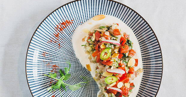 Тартар из сибаса с тхиновой пастой, томатами и миндалем от марокканского ресторана Nofar