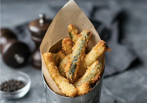 - Слегка отжать, обвалять в крахмале и жарить во фритюре (2 минуты).