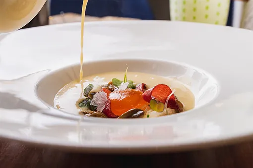 Сеты Адриана Кетгласа в Grand Cru – это отдельное удовольствие, и я все больше и больше начинаю его ценить. Февральский сет Адриану удался особенно — яйцо цесарки с кремом из сельдерея и трюфеля я вспоминаю до сих пор. Оно подается как суп, и вы не станете облизывать тарелку только из-за количества мужчин вокруг — в Grand Cru традиционно сильно присутствие большого количества интересных джентльменов. Второй тарелкой с таким же эффектом стала атлантическая форель с черным киноа, которая щедро поливается соусом из кокоса и кафрского лайма. Впрочем, остальные три подачи тоже выглядят феерично. И Grand Cru можно отметить как одно из мест, где не стоит пренебрегать предложением по винным парам, — я мечтаю снова попробовать Sancerre и токайское, что включены в этот сет. Надо, кстати, узнать, продаются ли они в тамошней винотеке.