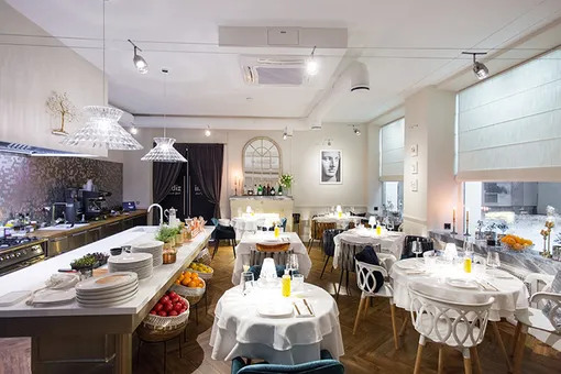 Я очень люблю этот ресторан, маленький и очень изящный. Если бы я открывала свой проект, то он выглядел бы точно так же – уютно и элегантно. В ресторане всего 6 столов, открытая кухня, где шеф готовит среди букетов душистых средиземноморских трав и корзин с фруктами. А хозяин Илиас Илиадис сам встречает гостей.