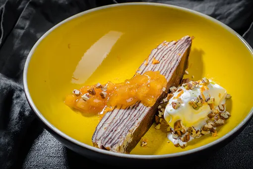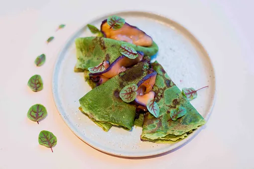 В матча-баре Touch of Matcha масленичное предложение не обошлось без главного ингредиента — чая матча. Шеф Егор Рудольский предлагает healthy-вариант блинов — веганские блинчики на льняном яйце с соусом из ягод облепихи, черной смородины, черники, клубники или фаршированные копченым тофу и водорослями с веганским соусом на основе терияки, кокосовых сливок и малины.