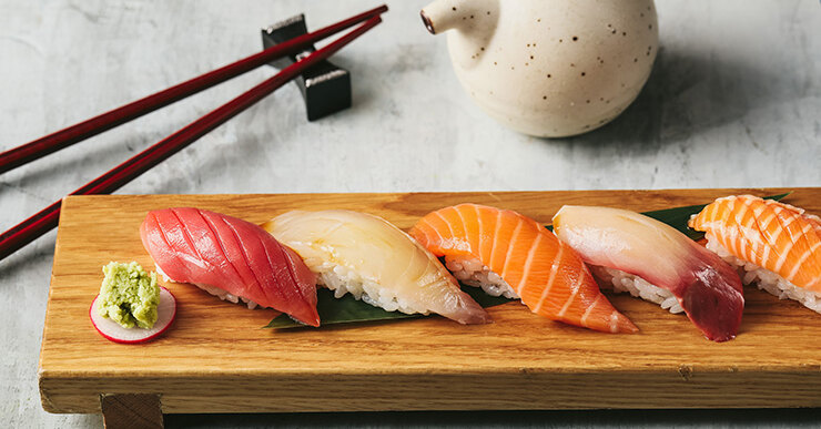 Шеф-повар Александр Ким рекомендует гунканы с угрем или крабом, хендролл с тунцом, суши хамачи или суши с креветкой.