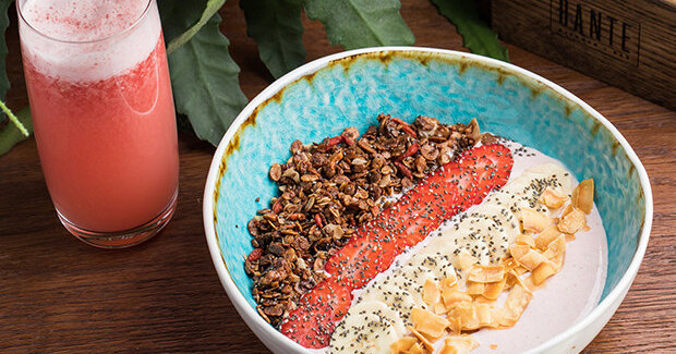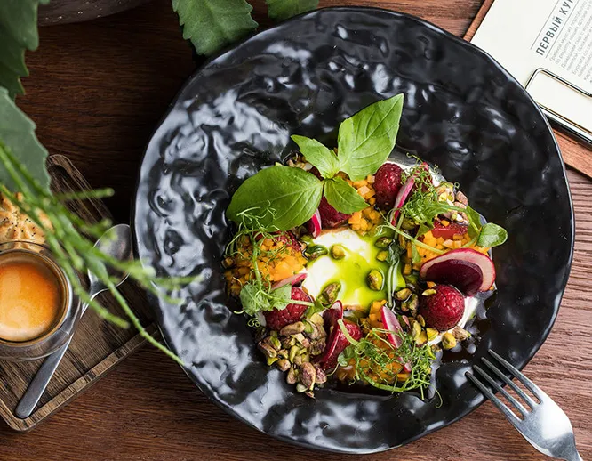 Помимо авторских новинок в меню завтраков есть и хиты Dante: салат из хрустящих баклажанов с моцареллой, базиликом и сладким соусом чили и домашний сыр с ягодами, маринованной тыквой, свеклой и фисташками.