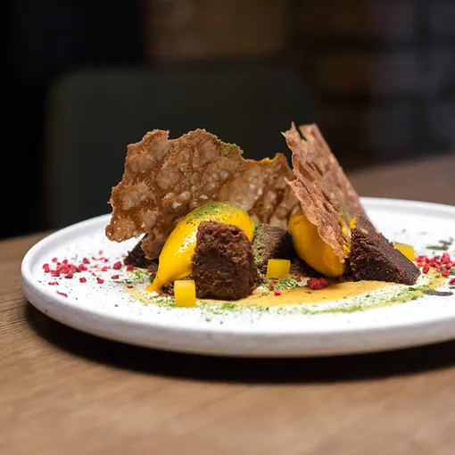 Эффектный финал для вашей дегустации. Это блюдо состоит из нескольких элементов, каждый дает свой акцент во вкусе и текстуре: насыщенный шоколадный брауни, карамель с перцем чили, хрустящий шоколадный тюиль и сорбет из облепихи с узнаваемым привкусом и кислинкой. Для создания удачной пары достаточно выбрать десертное вино с небольшим уровнем кислотности. Сицилийский мускат с легкой кислинкой гармонирует с сорбетом из облепихи. Сотерн, еще более кислотный, тоже сочетается по этому принципу. Очень важно, кстати, что десертные вина нужно подавать хорошо охлажденными, до 8-10 градусов, — так они гораздо лучше проявляют все прочие характеристики помимо сладости, а сахар в них не кажется слишком приторным.