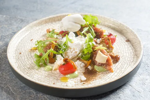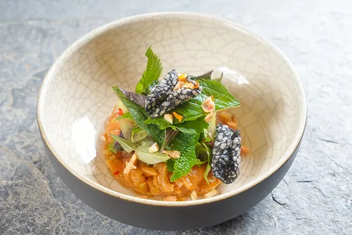 Блюдо – авторский взгляд на классический тартар, его готовят из утки, что само по себе встречается не так уж часто. Отлично заменит традиционный вариант из говядины, даже если до этого утка не была вашим фаворитом. Довольно мощное по аромату и вкусу мясо при этом заправлено маринованными опятами и помидорами черри, а также снегом из пармезана.