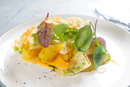 Сверхлегкая горячая закуска, которая точно не заставит думать о лишних килограммах, – все очень сбалансированно и в меру. Это блюдо вообще одно из самых удачных для экспериментов для foodpairing — тонкий в ароматике гель из лайма, сладковатые ноты батата. К нему в пару отлично подойдет именно новозеландский совиньон-блан, яркий и богатый, особенно на отличительные цитрусовые ноты: лайм, цедра апельсина, мякоть помело. Советуем попробовать совиньон из Новой Зеландии урожая 2015 года. Так же созвучен блюду будет и луарский шенен блан (ремю) 2014 года. В нем есть сладкие ноты, как в рислинге позднего сбора, и потрясающий баланс сладости и кислоты, такой баланс вторит и нашему блюду.
