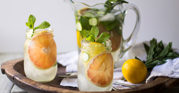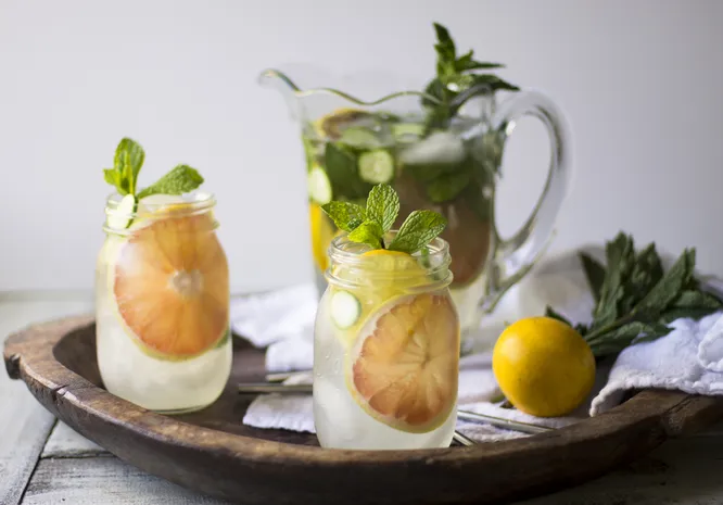 Смешайте в миске порезанный на кружочки огурец, небольшой, пять сантиметров, кусочек имбиря, предварительно мелко потертый, несколько лимонных долек с кожурой, горсть листьев мяты и щепотку гималайской соли. Пусть напиток побудет в холодильнике 5-6 часов, чтобы настояться. Такая вода не только улучшит пищеварение и заставит жир сгорать с ускоренной силой, но и поможет при заболеваниях горла.