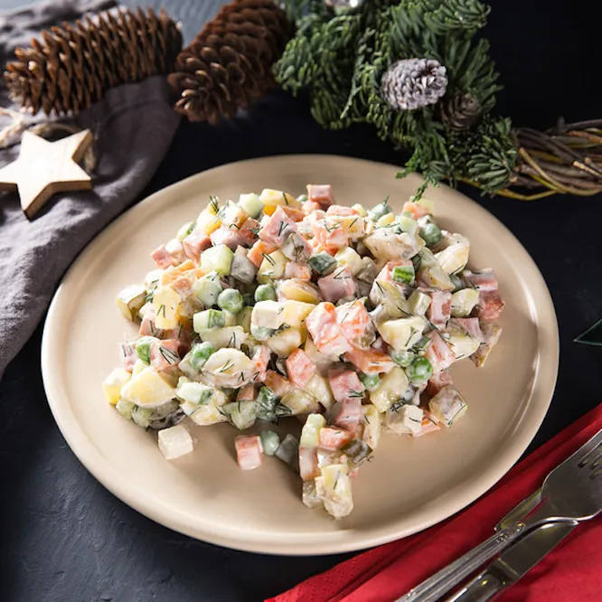 Новогоднее застолье не считается новогодним, если в центре стола не красуется тазик с оливье — полноправным символом праздника наряду с елкой. Даже те, кто держится подальше от ночных углеводов, не могут устоять перед этим шедевром русской кухни. Мы спросили у поваров сети магазинов полезных продуктов «Город-Сад», как свести риски к минимуму. Ниже рецепт веганского полезного оливье, которое можно есть после 12 без зазрения совести.