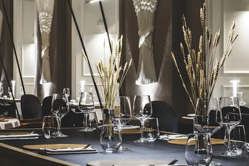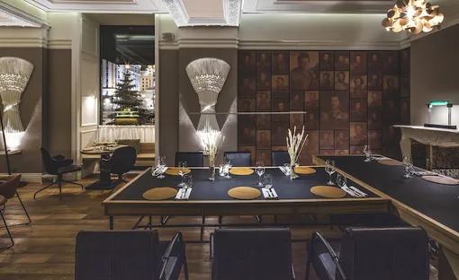 О прежнем месте напоминают лишь отреставрированная узорная лепнина на потолке и просторное помещение на нижнем этаже, где в далеком прошлом располагалась пивоварня, теперь преобразованная в домашнюю пекарню и собственную сыроварню. А вот привнесенный в интерьер декор – лаконичный, родной сердцу, без крикливости – отлично подчеркивает русскую тематику проекта. Барельефы из букетов пшеничных колосьев и гипсовые яйца, уголок с портретами героев Отечественной войны 1812 года... Приглушенный свет компенсируют итальянские светильники, точечно подсвечивающие каждое блюдо, а комфортная мягкая мебель, с легкой руки Лизунова названная «гастрономичной», позволяет полностью отвлечься от суеты мегаполиса, расслабиться и сконцентрироваться на еде.