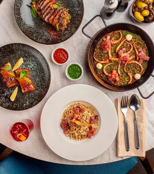 За кухню пригласили отвечать шеф-повара Илью Левашенко, у которого за плечами работа в московском Grand Cru и сотрудничество с мишленовским поваром Адрианом Кетгласом. Интересно, что несмотря на очевидный испанский характер ресторана, в меню можно найти лучшие гастрономические рецепты со всего мира. Рекомендуют пробовать осьминога с пюре из сельдерея и укропными сливками, копченого угря на моркови конфи, гребешок с соусом из белых грибов и черным трюфелем или гребешок с соусом из фуа-гра и птитимом, томленое говяжье ребро Кальби с соусом порто, фуа-гра, тартары из мраморной говядины с муссом из пармезана или из авокадо с базиликовым соусом и многое другое.