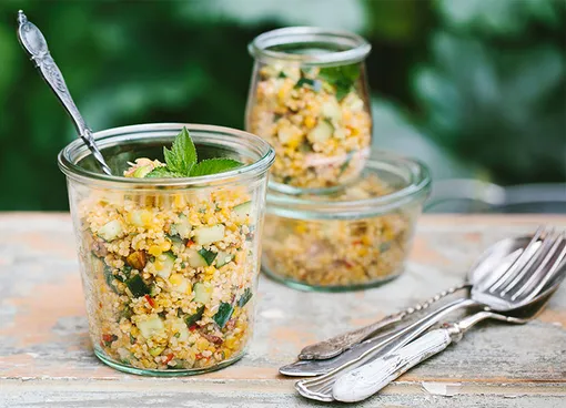 Два модных ингредиента — булгур и киноа — сделали этот салат необычайно полезным. В состав круп входят белки, аминокислоты, клетчатка и витамины группы В. Регулярное употребление салата помогает пищеварительному процессу, уменьшает уровень холестерина и выводит из организма шлаки.